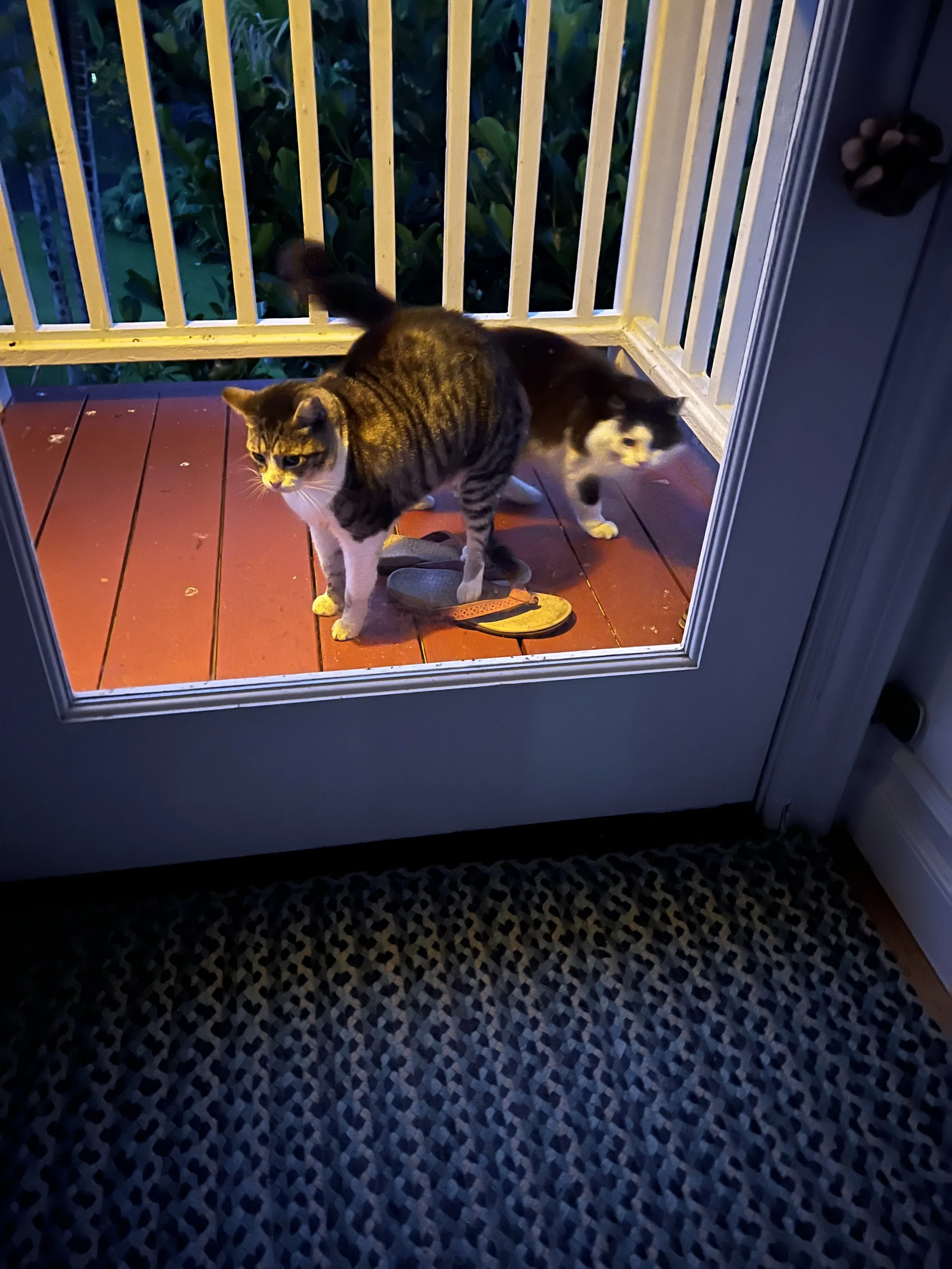 I carefully dole the food out per the instructions I was given, and feel quite proud of myself that I have gotten my first assignment right. I look down at the purring cats contentedly eating and reach for the door to go inside– not so fast honey, you just locked yourself out.